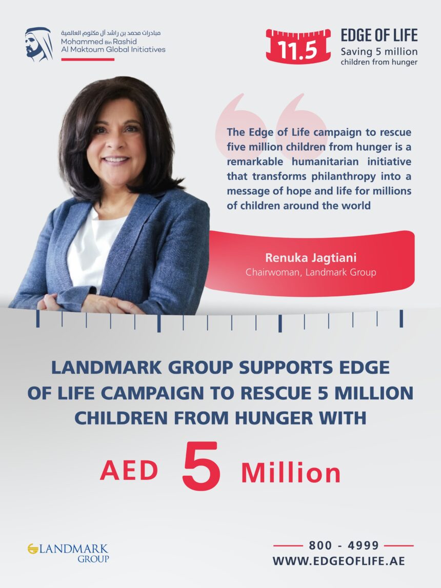 The Edge of Life campaign to rescue five million children from hunger is being organised in partnership with UNICEF, Save the Children, the Children’s Investment Fund Foundation (CIFF), and Action Against Hunger. Renuka Jagtiani, Chairwoman, Landmark Group, stated, “The Edge of Life campaign is a remarkable humanitarian initiative that transforms philanthropy into a message of hope and life for millions of children around the world, empowering them to overcome adversity, and look toward a brighter future with renewed confidence.”